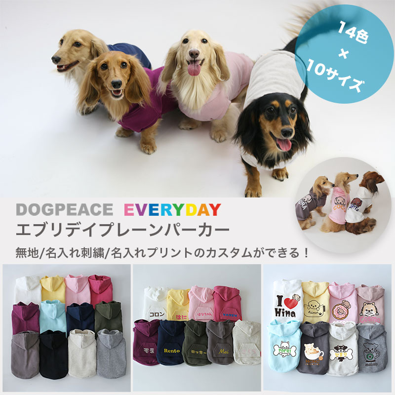 愛犬の毎日を彩る、エブリデイ・プレーン・パーカー。無地・名入れ刺繍プリント対応のカスタムも。