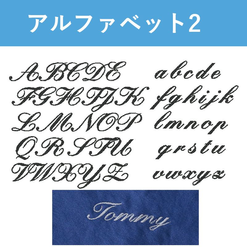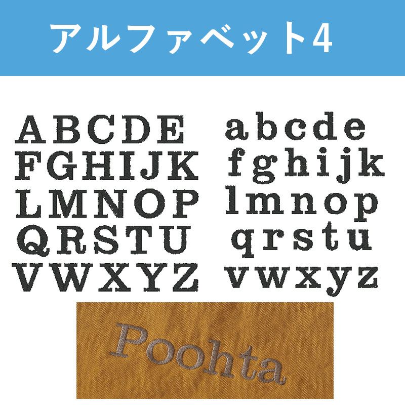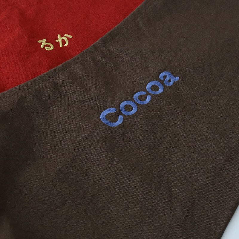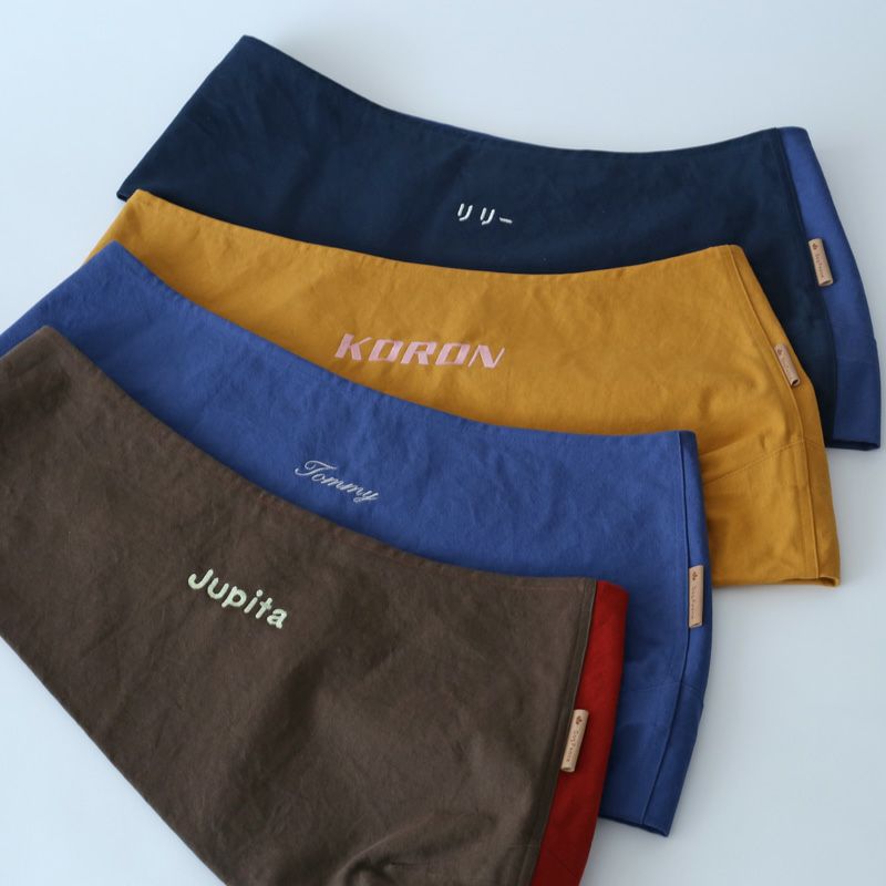 6色の糸と3つのフォントから名入れや好きな言葉を刺繍できます。倉敷産帆布ドッグスリング専用名入れ刺繍
