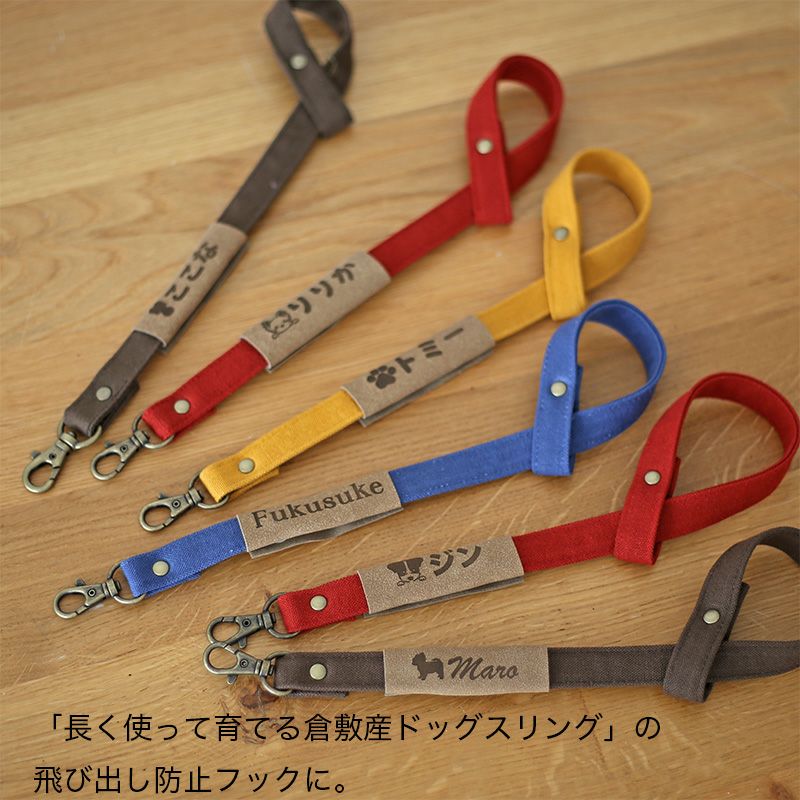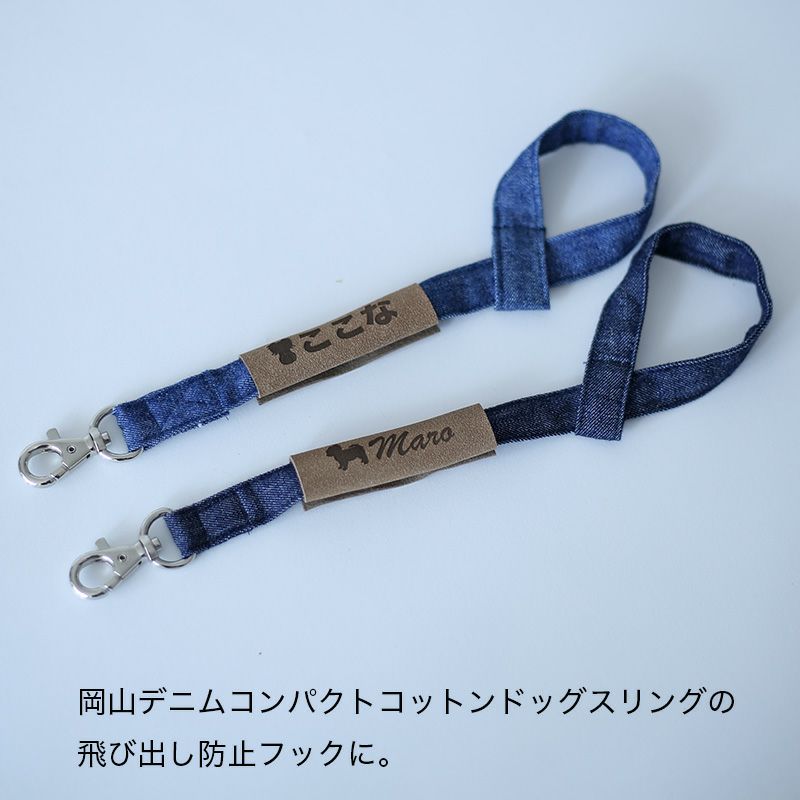 エブリデイコンパクトドッグスリング、倉敷産帆布スリング、岡山デニムスリング、クールMAXドッグスリングの4つのスリングには、オプションで刺繍やプリントが出来ます。うちの子に似たドッグイラストを入れたり、名入れや好きな言葉を入れてうちの子だけのドッグスリングアレンジを楽しんでみませんか? さらに飛び出し防止フックに刻印タグでの名入れオプションもあります。