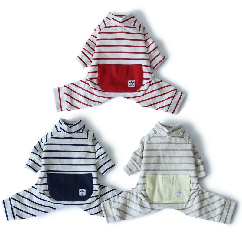 背中と腰から冷やす保冷剤ポケット付きボーダーコットンニットカバーオール | 犬服通販ドッグピース