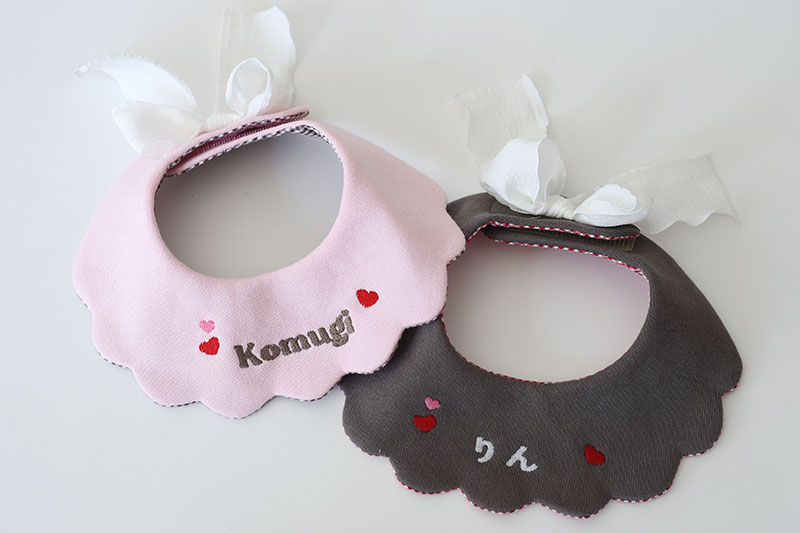 首元に、ふわっと小さなおめかし。 スカラップのやさしい曲線に、ハートとお名前刺繍をちょこんと添えたリボンビブです。