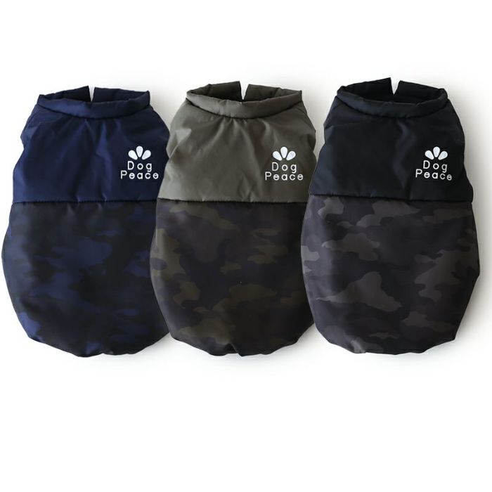 冬のアウトドアに着せてあげたいカモフラージュ柄のシンプルなベストスタイル。落ち着いたネイビー・カーキ・ブラックの3色。