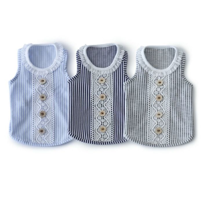 ストライプ柄のクールMAX素材で作った、ナチュラルクラシカルな夏タンクトップ。背中、首周りにレースをふんだんに使った贅沢な一品。ウッドボタンにもこだわっています。