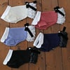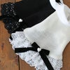 シンプルな畦編みニットのトップに、水玉シフォンとレースのゴージャスな三段フリルスカートの組み合わせ。とっても上品でかわいいワンピースが出来上がりました。すとんと着せてあげるだけで、きちんとかわいくなるワンピースです。襟のパールの飾りとリボン。腰のベルベットリボンとパールハートとボタン。細部まできちんとかわいいのもポイントです。