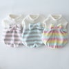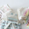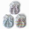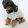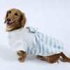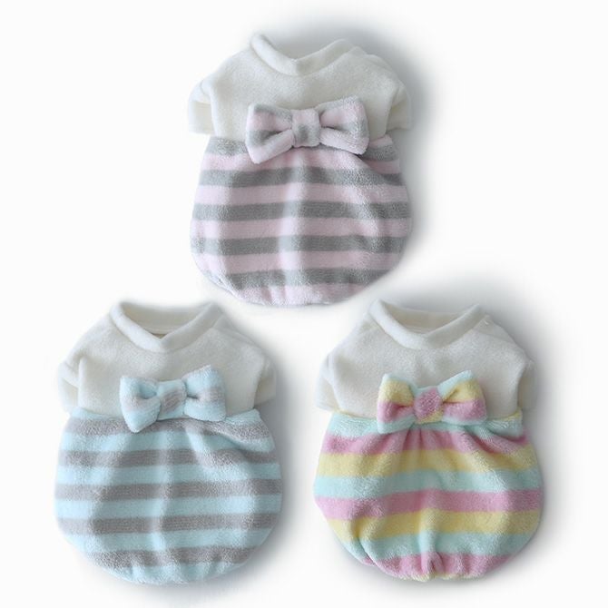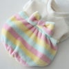 とっても手触りのいいボアフリースのボーダー生地で作った、冬のここぞというお出かけに着たいふんわりバルーンチュニック。素材やかたちだけでなく、色もふんわりとやさしいパステルカラーを選びました。背中の大きなリボンが着映えポイント。さらに胸元の、中央にパールカラーのビーズを置いた花モチーフのレースアクセントも、上品な印象を与えてくれます。女の子ワンちゃんの今年の冬を素敵にするためのマストな1着です。