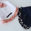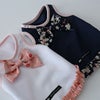 和柄の小花柄生地をリボンとフリルにしました。シンプルながら、とても可愛い1着に仕上がっています。