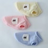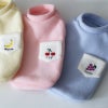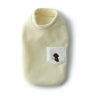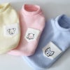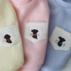クリームにはバナナ、ピンkにはさくらんぼ、ブルーにはぶどうのワンポイント刺繍となります。名入れ文字は全色黒になります。