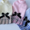首もとをあっためるハイネックフリースのトップにチェックのプリーツスカートの組み合わせ。ベルベットとパールバックルのブラックリボンがきちんと感を演出します。