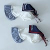 すぽんと着るだけで全身かわいいワンピースタイプのセーラ服です。白のさわやかな天竺ニットに紺色のカラー。スカートも2枚重ねのふんわりコットンととっても贅沢な仕様になっています。2種類のリボンが付いていますので、倍楽しいのもうれしいです。