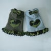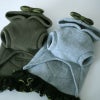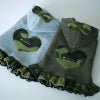 カモフラージュと無地のフリースを組み合わせた、軽くてあったかいフリースワンピース。なんといっても背中のハートアップリケとフードのリボンが、おてんば感をだして可愛い。ギャザースカートにレースを組み合わせたしっかりきれいめな部分にも注目!
