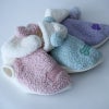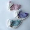ピンクにはリボン、パープルには大きめメランジ梵天。グリーンにはまるみみ梵天。