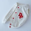 アイボリーカラーのシンプルでスタイリッシュな「DP」ロゴカーディガン。優しいデザインで、お散歩や毎日のお出かけにぴったりです。