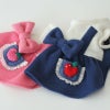 背中には愛らしい大きなリボン、ポケット部分にはりんご編みぐるみととレースが施され、細部までこだわりがいっぱい。見るたびに笑顔になれるデザインです。