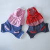 ドットとギンガムチェックの2段重ねフリルのトップスに、ニットデニムのパンツを組み合わせた、アクティブなカバーオールです。背中の大きなリボンとお尻のポケットのリボンもポイントです。パンツ部分は伸縮性のある、ニットデニム素材を使っているので動きやすいですよ!色はピンクとレッドの2色です。ズボンの裾にも白のレースがあしらわれていて、女の子らしさいっぱい!キュートでアクティブな女の子におすすめの1着です。