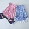 やっぱりかわいい。ギンガムチェック生地の襟なし、ノーススリーブブラウスと同素材のレーススカートのツーピース。 たっぷりフリルはハッと目を惹く1着です。もちろん、スカートを他のマッチングボトムと付け替えて楽しむことも可能。予約&セットでお求め安いお値段です。