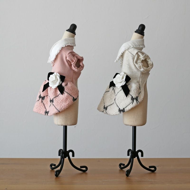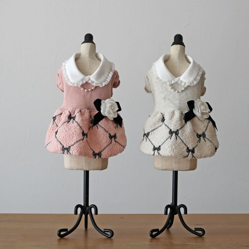 【終売のためアウトレットプライス-売り切れしだい入荷はありません-】 ピンクプリエ・リボン柄コサージュ・ワンピース