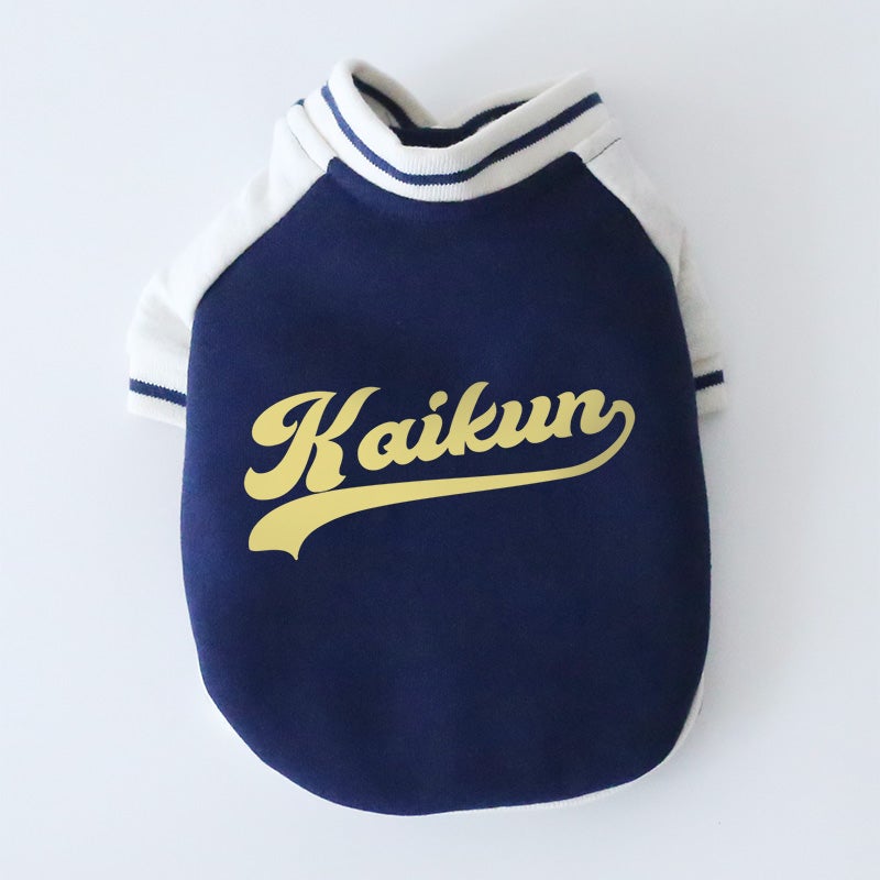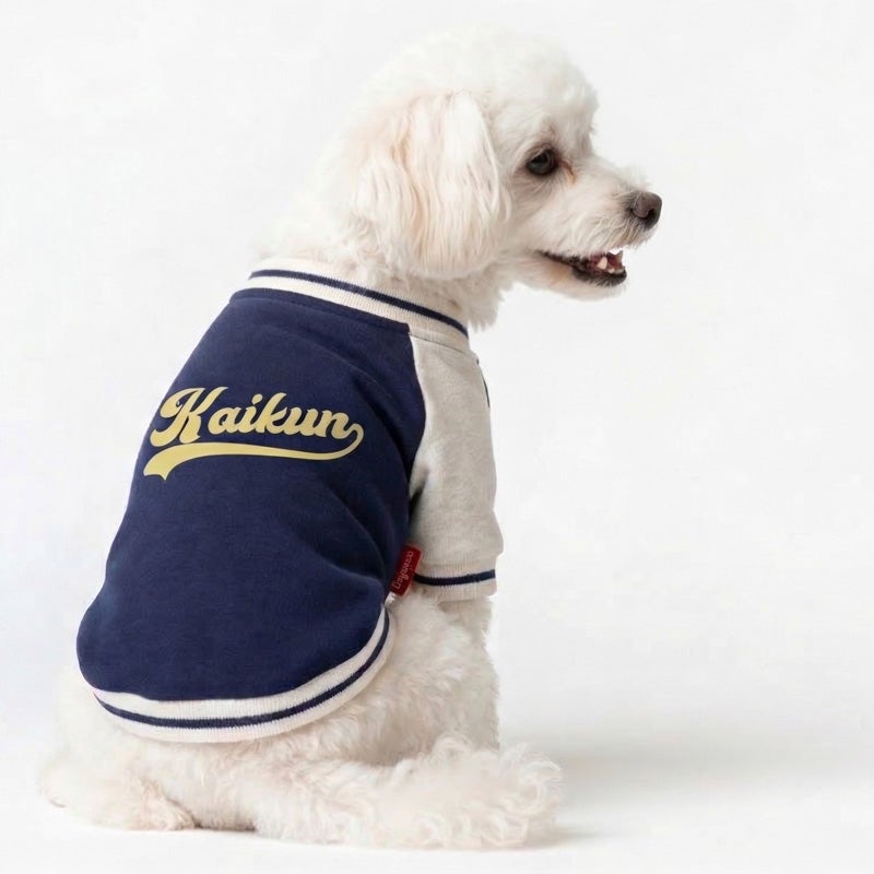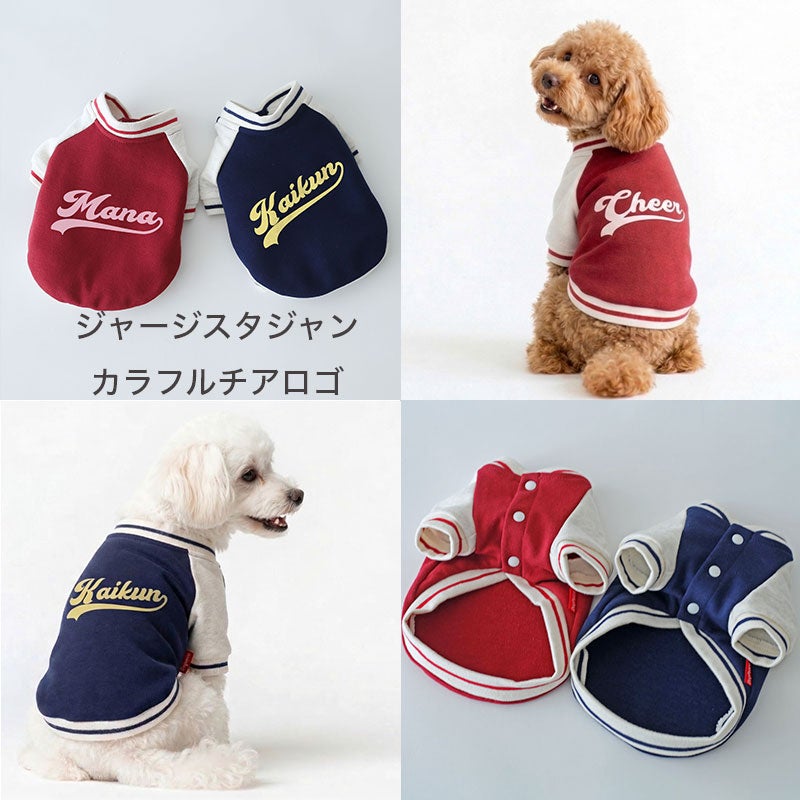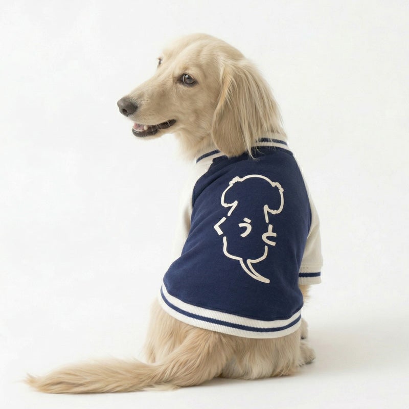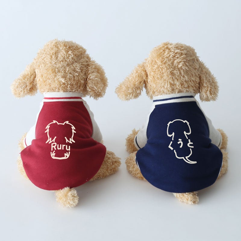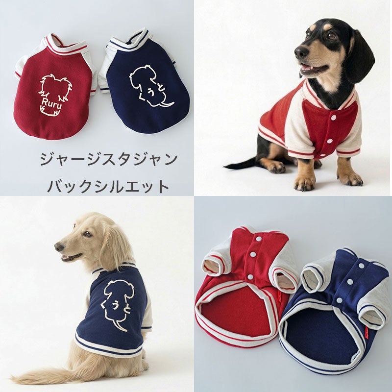 愛犬の毎日に「ちょっと特別」をプラスする、ニットジャージ素材で仕立てた、やわらかく着心地のいいスタジャン風ウェアです。 うしろ姿まで、ちゃんと愛しい。 そんな気持ちをそのまま背中にのせたような、名入れプリントのジャージスタジャンです。