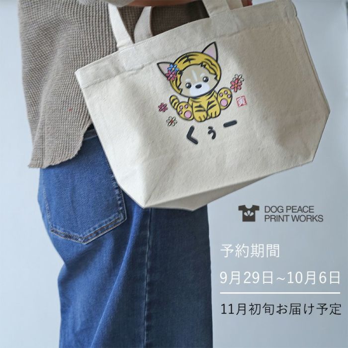 来年の干支の寅の着ぐるみを着たワンちゃんのプリントがキュートな帆布バッグです。12年に一度の思い出づくりに、いかがですか♪
