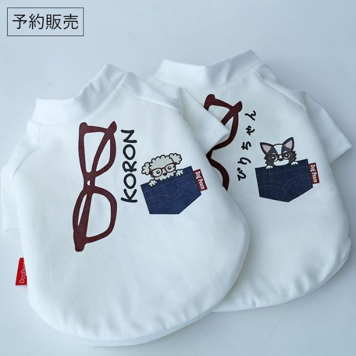 爽やかな白Tシャツに定番メガネプリントと、デニムポケットからワンちゃんが覗き込んでいるキュートなイラストプリント。もちろん名前入りです。1週間だけの予約受付です、お忘れなく。