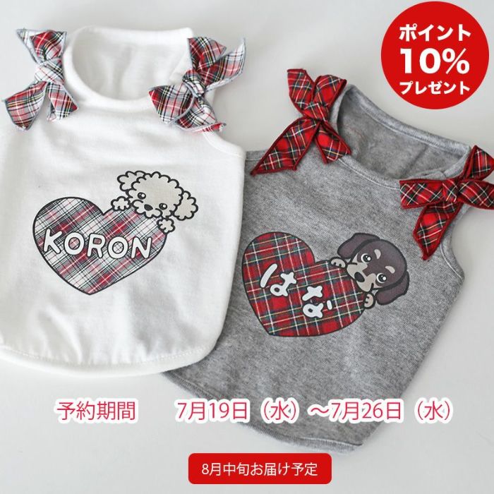 タータンチェックハートと71種類の犬種プリント。肩のリボンもかわいい、お名前ラブタンクです。ボディーカラーをホワイトとグレーから選び、チェックのカラーをホワイトレッドとレッドの2種類からお選びください。季節問わず着れてお気に入りの1着になるでしょう。