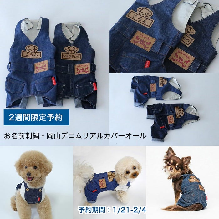予約限定・特別価格で、あの人気デニムが帰ってきた。 ジーンズの産地として名高い岡山デニムを使った、見た目も着こなしも本格派の一着。ステッチやポケット、ベルト風デザインまで、まるで小さなオーバーオールみたいにリアルに仕立てました。 デニムは比較的薄手でやわらかめをセレクト。デニムらしい雰囲気はそのままに、ワンちゃんが動きやすい軽やかな着心地を目指しています。 そのまま一枚でさらっと着ても可愛いですし、ベストやパーカーと重ね着すれば、ぐっと“こなれた”コーデに。季節をまたいで楽しめるのもデニムのいいところです。 そして、この復刻モデルのいちばんの楽しみは「うちの子仕様」にできること。 背中のお名前刺繍と、腰まわりに付く犬種別タグは、16種類から選択OK。選ぶ時間も、届いてから着せる時間も、特別なワクワクになります。 2週間だけの予約限定&特別価格となりますので、気になる方はぜひお早めにチェックしてくださいね。