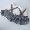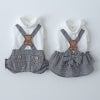 白いトップスに肩ひもをかけたようなサロペット風のデザインは、 男の子にはボタン付きパンツ、女の子にはリボンが揺れるフリルスカートを。