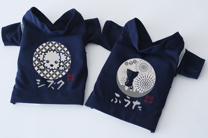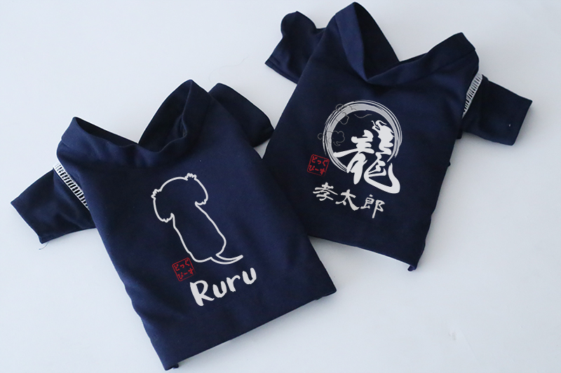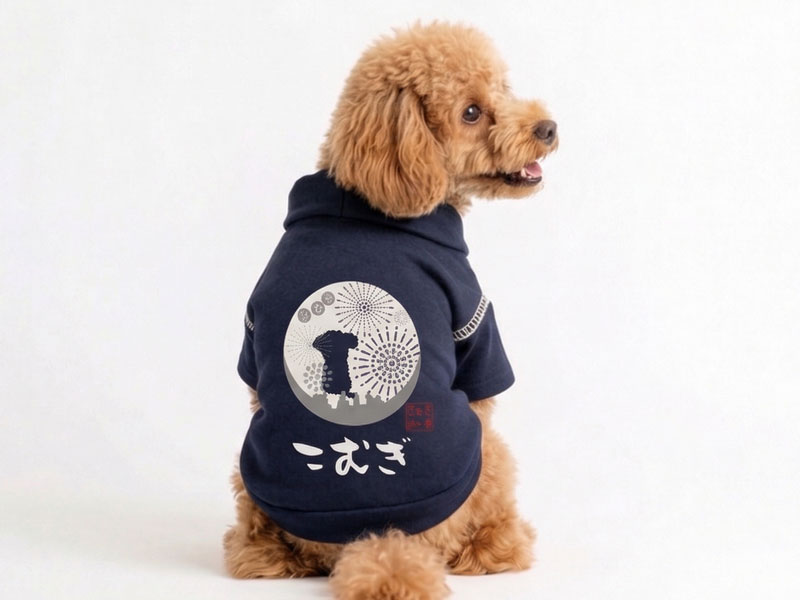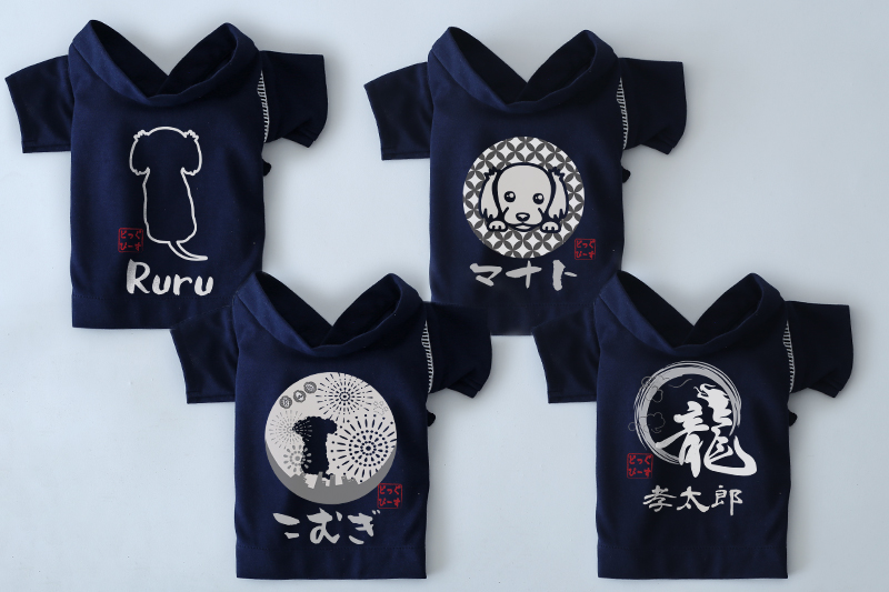 落ち着いた濃紺カラーに、背中には選べる和テイストのデザインをプリント。 犬種フェイス、シルエット、花火柄、力強い漢字モチーフなど、それぞれ雰囲気の異なる4つのスタイルからお選びいただけます。 お名前を入れることで、愛犬だけの特別感がぐっと高まります。