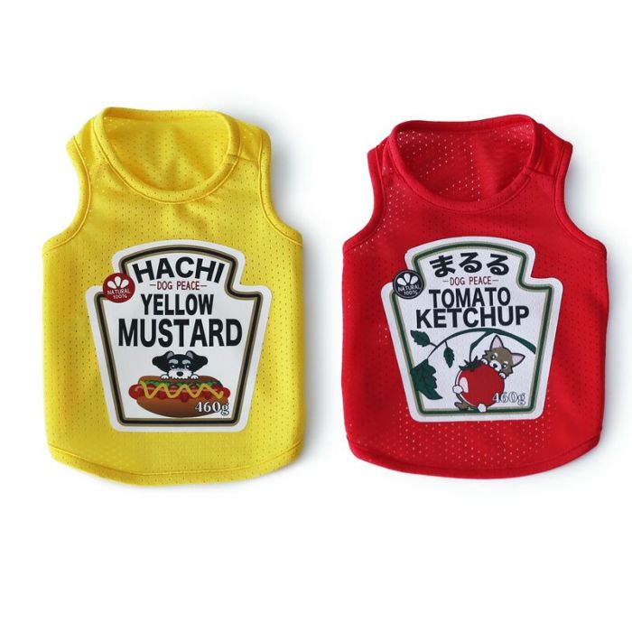 かわいいケチャップとマスタードにお名前と犬種別プリントができます。通気性のよいメッシュ・クールスプラッシュ素材で作ったタンクトップです。ケチャップとマスタード、どっちにするか大いに悩んでください♪