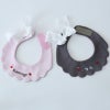 首元に、ふわっと小さなおめかし。 スカラップのやさしい曲線に、ハートとお名前刺繍をちょこんと添えたリボンビブです。