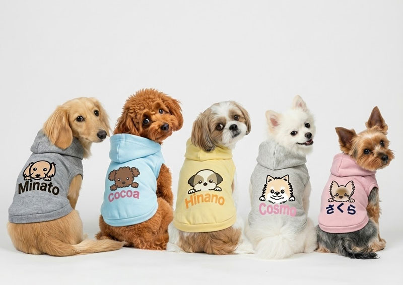 フードの見え方、刺繍やプリントの印象も、犬が過ごしやすいことを前提に「可愛い」を積み上げる設計。着せた瞬間に違和感が出にくいのが特長です。加えて、名入れプリントや名入れ刺繍で「愛犬だけの世界に一着」を作れるので、お出かけや写真の満足度もぐっと上がります。