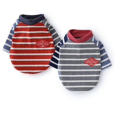 オシャレなTシャツです。生地の感じからいくとトレーナーに近い気がします。痩せぎみのトイプーなので、このボーダーで少しふっくらして見えるかも。春秋にちょうどいいと思います。