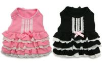 マルチーズ2.2kgの女の子にDSSを購入しました。少し短めの丈なのでマッチングのスカートを合わせました。はっきりとしたピンクと4段のフリルが可愛いです。袖がないので着やすいです。